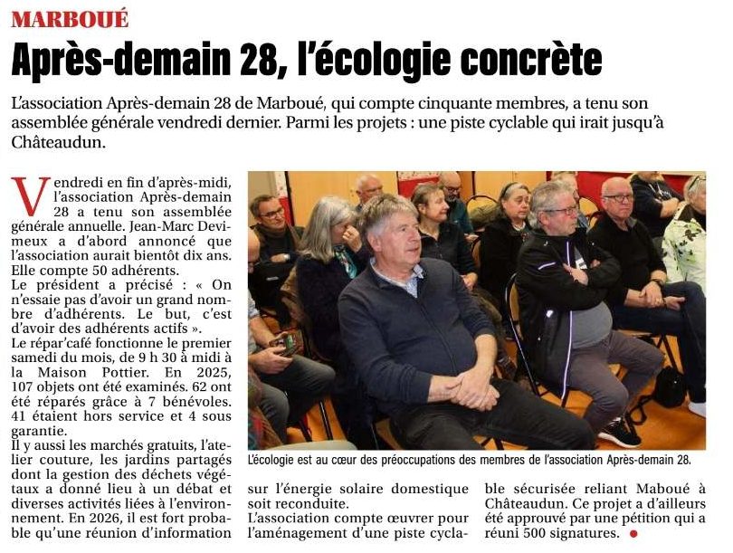 Après la présentation des traditionnels bilans et la réélection de notre trésorier, nous avons pu échanger autour de projets, découvrir les actions menées localement et partager des idées pour continuer à faire avancer, ensemble, les démarches durables dans le sud de l’Eure‑et‑Loir.Merci à la mairie de Marboué, toujours disponible pour accompagner les initiatives qui renforcent la vie locale et l’avenir de notre territoire, au Conseil Départemental pour leur soutien et aux membres de l’association pour leur dynamisme.