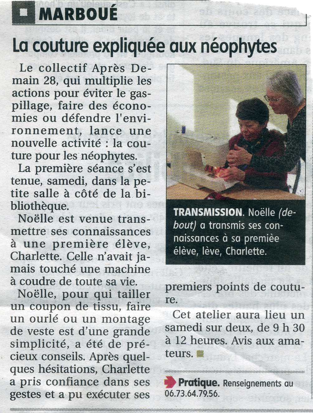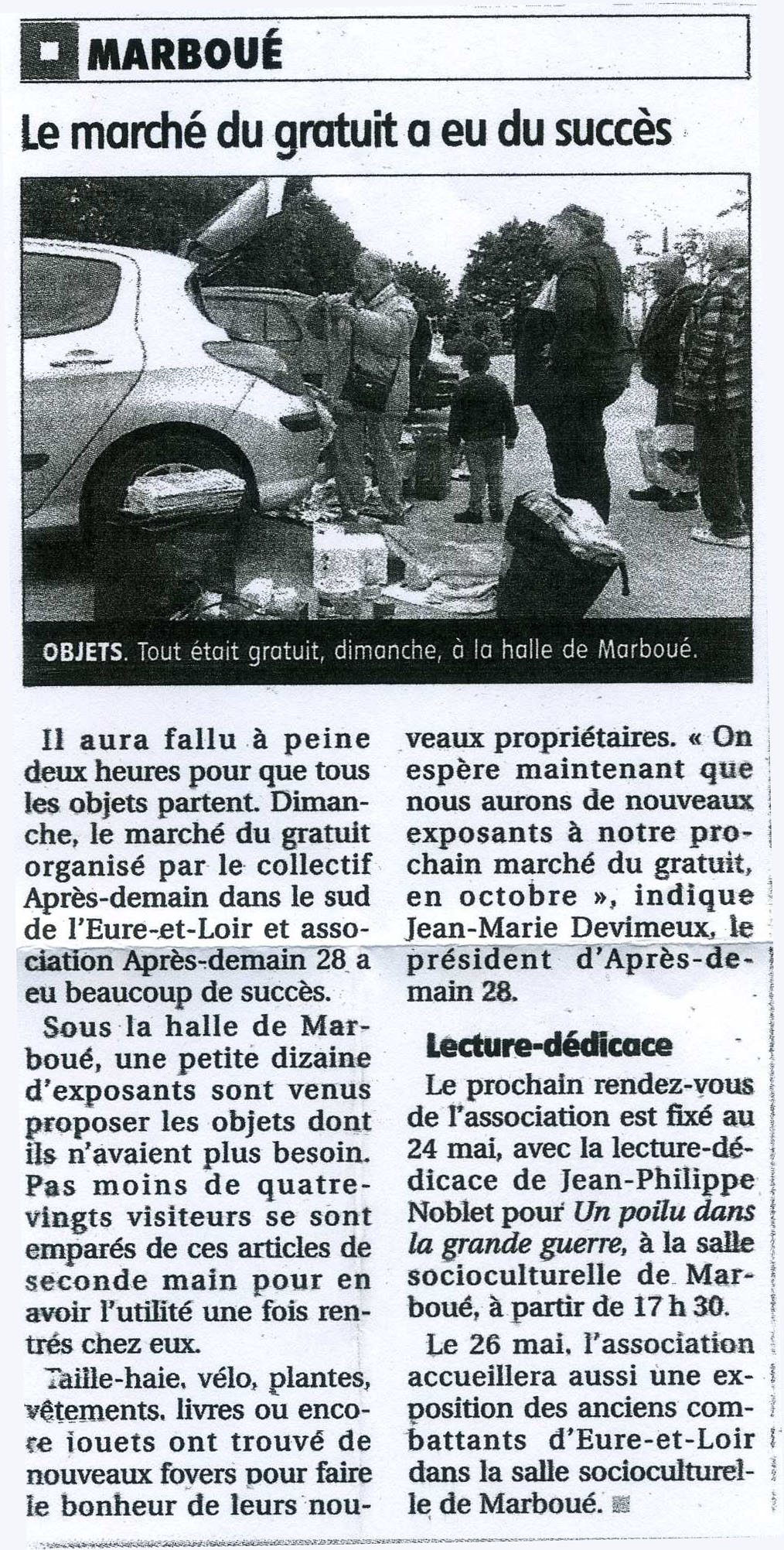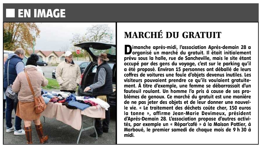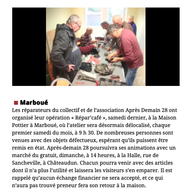 Articles de presse Assemblée Générale du 07 février 2026Source Echo Républicain du 09/02/2026 Répar’CaféSource Echo Républicain du 06/01/2026 Marché du gratuit du 09/11/2025 à ChâteaudunSource Echo Républicain du 11/11/2025 Atelier Impression 3D à Marboué Source Echo Républicain du 07/12/2025 Café réparation 01/11/2025Source Echo Républicain Marché du gratuit à MarbouéSource Echo Républicain Atelier coutureSource Echo Républicain
