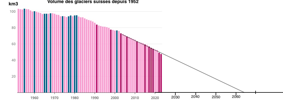 Selon l’Académie suisse des sciences naturelles, les glaciers suisses ont diminués de plus de 50% en volume depuis 1952, à ce rythme, ils auront disparu en 2065 !